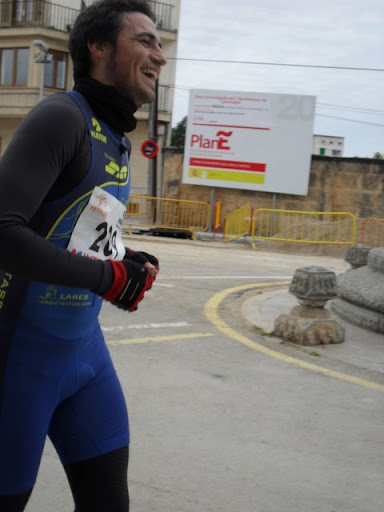 Salió mucho más tarde que el que iba delante, así que no sabía cuando volvería. Llegaban los ciclistas poco a poco, los primeros venían a mil, y aun quedaba una buena docena esperando cuando veo al Gordon venir por el camino todo chuscao!! Es mi ídolo!! Lo había dejado todo por la saga Lares y había adelantado a un huevo, así se lo digo cuando pasa por mi lado y espero a que deje la bici. Había sido el 8 mejor tiempo en bici de los 43 equipos. Total que me dio el chip y salí a toda pastilla. Adelanté a un par en los primeros metros pero puf!! vaya sprint más tonto me he dado... vamos que empiezo correr normalito como lo hace uno que no entrena casi nada de correr y voy adelantando algunos más, salvo uno que me adelanta a mi. El viernes en el acuaentreno lo di todo en la carrera y se notó que tenia las piernas cansadas (en esto sigo siendo un cutre). Llego a meta dejando el resto siendo el 20 mejor tiempo de los 43 mencionados, quedando el 25 en la general. Bueno no ha estado mal del todo. Jose decia que quedariamos últimos, yo decía que haríamos podium, al final media tabla y todos contentos. Vicente no volveré jamás a hacer una de estás dijo (aunque ya le estoy tanteando para otra jejej).